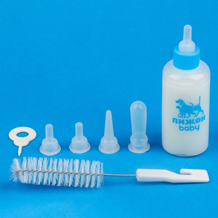 Набор для вскармливания щенков, котят и грызунов ПИЖОН. В комплекте содержится: 1 бутылочка объемом 60 мл, 4 соски, 2 короткие длиной 2 см, 1 длиная с тонким носиком 3 см, 1 длиная с толстым носиком 4 см, 1 ершик-щётка для мытья бутылочки. Показания к применению: для искусственного вскармливания новорожденных и подрастающих щенков, котят и других животных, а также для кормления больных и выздоравливающих животных. Способ применения: кончик резиновой соски проткните иглой или отрежьте верхушку ножницами. Будьте осторожны, потому что из-за слишком большого отверстия в соске животное может подавиться. После каждого использования, тщательно помойте бутылочку и соску.