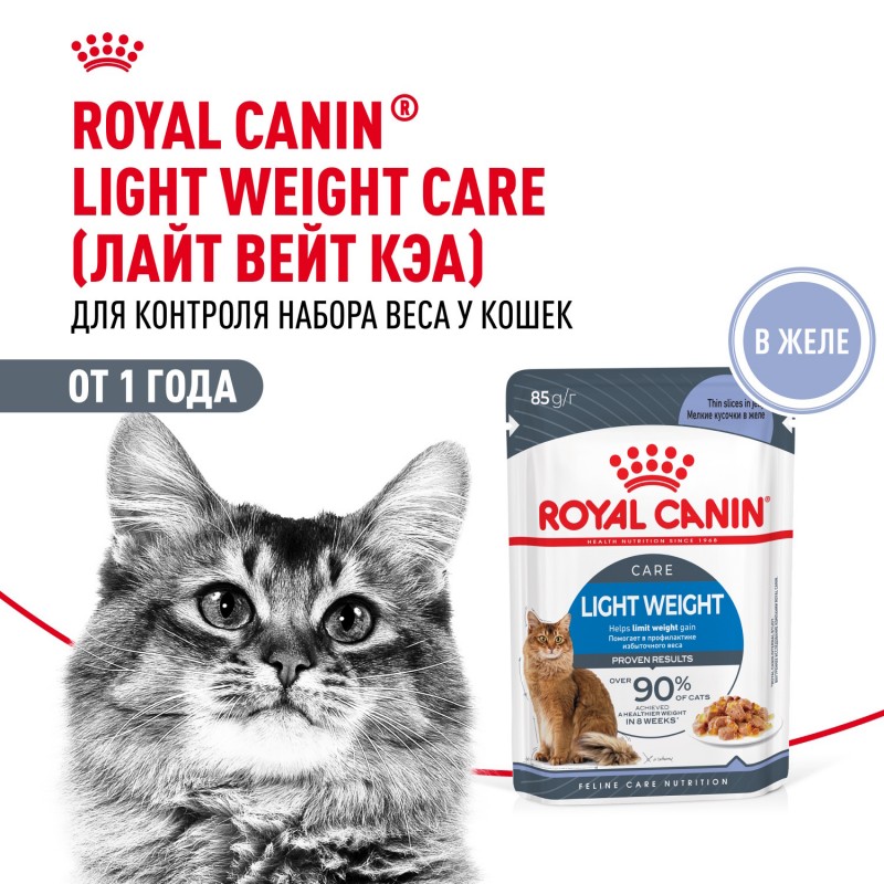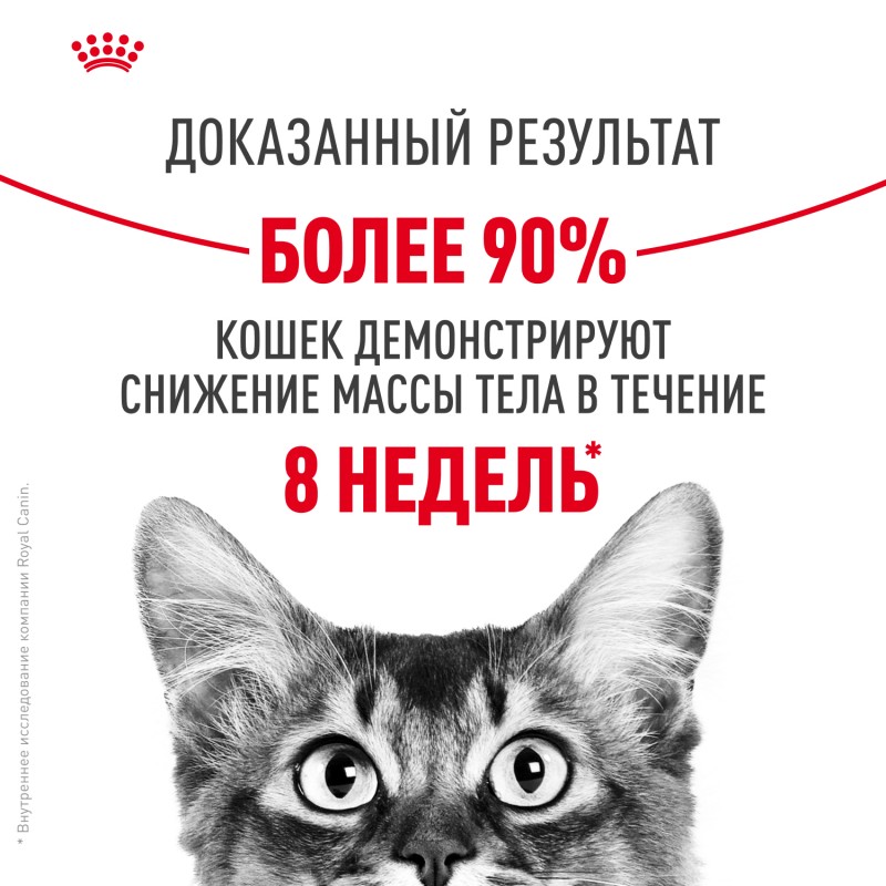 *Доказанные результаты : более 90% кошек достигли более здорового веса в течение 8 недель при потреблении рационов Royal Canin Light Weight Care (сухой и влажный корм). Внутреннее исследование Royal Canin, 2022