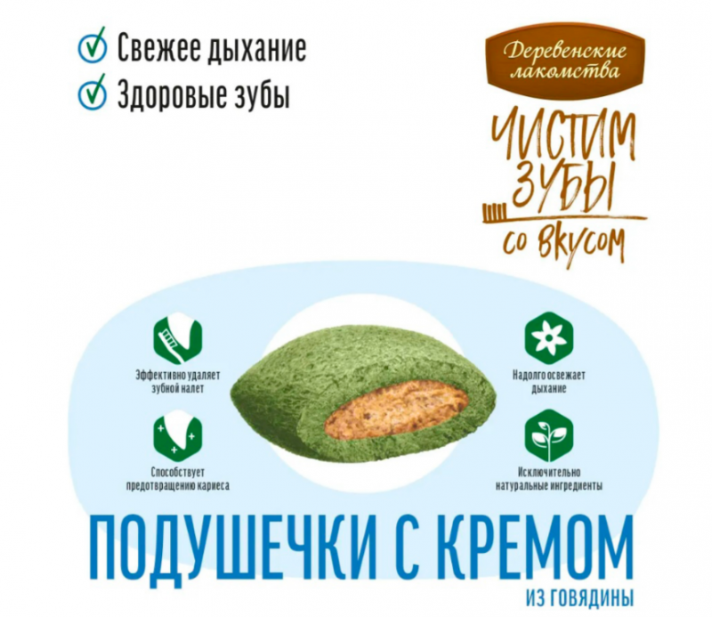 Хрустящие подушечки, благодаря своей пористой структуре, удаляют зубной налёт, предотвращают образование зубного камня и освежают дыхание.