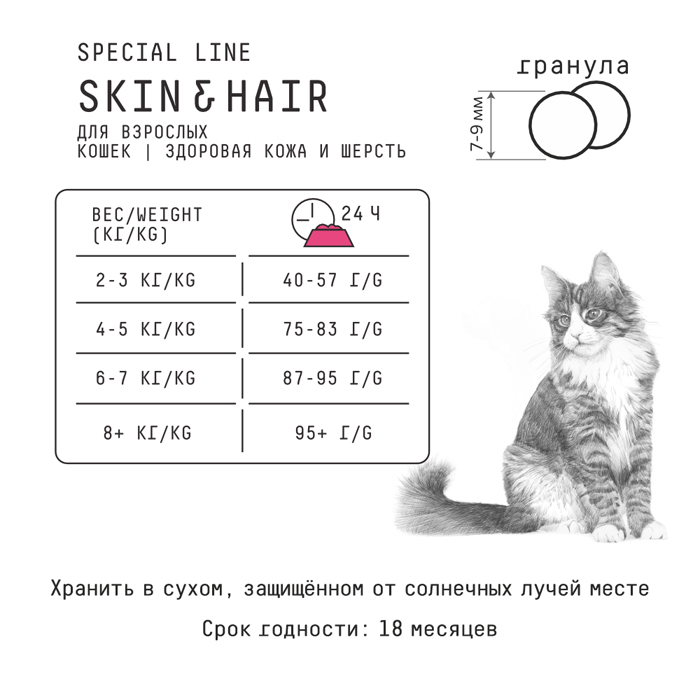 Особый баланс аминокислот, витаминов и минералов, удовлетворяющий потребности длинношерстных кошек, а также кошек с проблемами кожи и шерсти.
