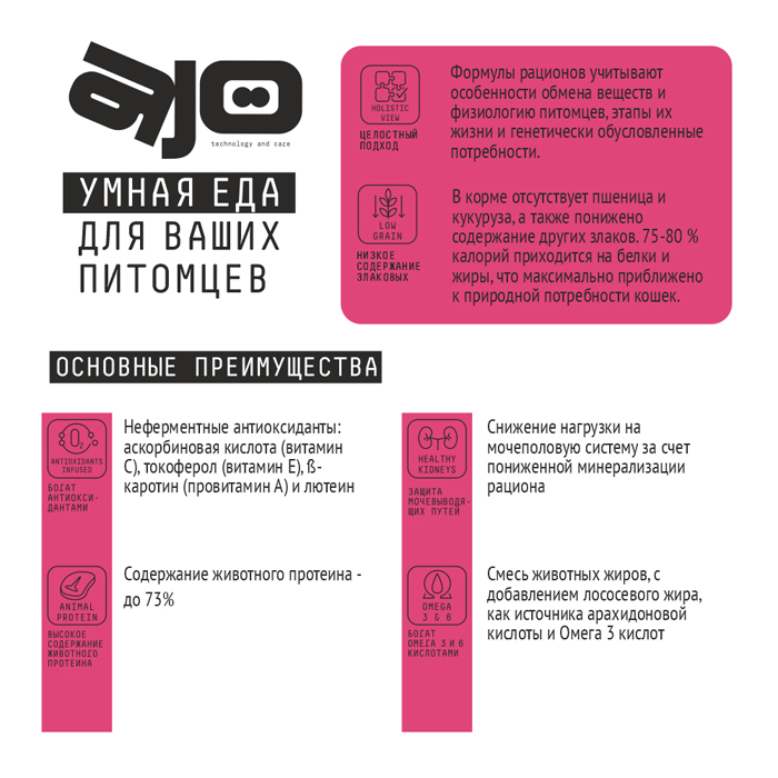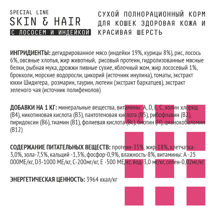 Ингредиенты: дегидрированное мясо (индейки 19%, курицы 8%), рис, лосось 6%, овсяные хлопья, жир животный, рисовый протеин, гидролизованные мясные белки, рыбная мука, дрожжи пивные сухие, яблочный жом, жир лососевый 1%, брокколи, морские водоросли, цикорий (источник инулина), томаты, экстракт юкки Шидигера, розмарин, таурин, лютеин (экстракт бархатцев), экстракт зеленого чая (источник полифенолов). Добавки: минеральные вещества, витамины: А, D, Е, С, холин хлорид (В4), никотиновая кислота (В3), пантотеновая кислота (В5), рибофлавин (В2), пиридоксин (В6), тиамин (В1), фолиевая кислота (Вc), биотин (Н), цианокобаломин (В12). Питательные вещества: влажность-8%, протеин-35%, жир-18%, клетчатка-3,0%, зола-7,5%, кальций -1.3%, фосфор-0.9%, Витамины: А -25 000 МЕ/кг, D3-1000 МЕ/кг, С-200мг/кг, Е -500 МЕ/кг., йод-3,0 мг/кг, селен-0,02мг/кг. Омега-6 и -3 жирные кислоты –3.55%.