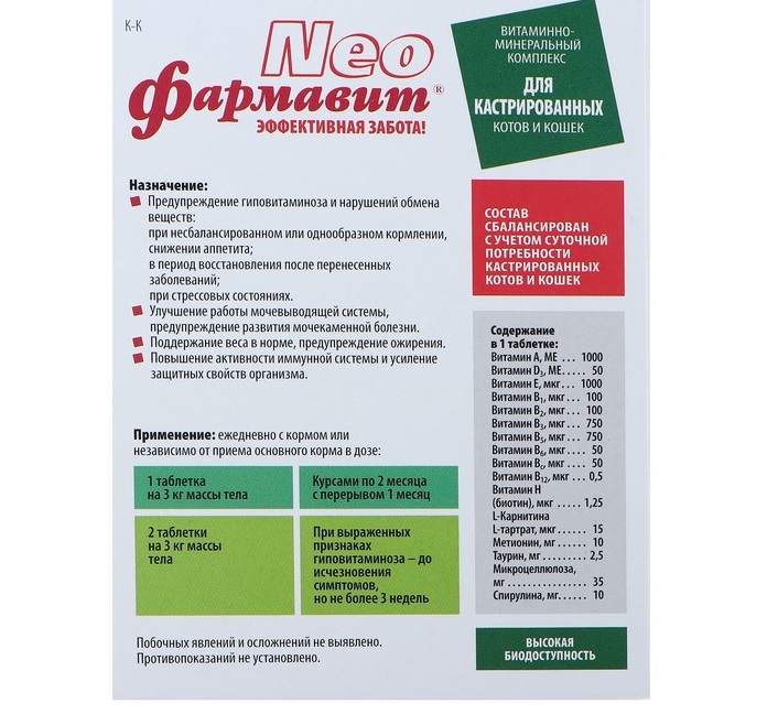 Биологические свойства кормовой добавки обусловлены наличием витаминов, аминокислот, спирулины, целлюлозы микрокристаллической, включенных в её состав в оптимальном соотношении и с учетом физиологической потребности кастрированных котов и кошек. Кроме того, в состав кормовой добавки входят пивные дрожжи, в которых высокое содержание витаминов группы B, легкоусвояемого белка, содержащего все незаменимые аминокислоты, незаменимые жирные кислоты, макро- и микроэлементы, такие как магний, железо, марганец, цинк и др.