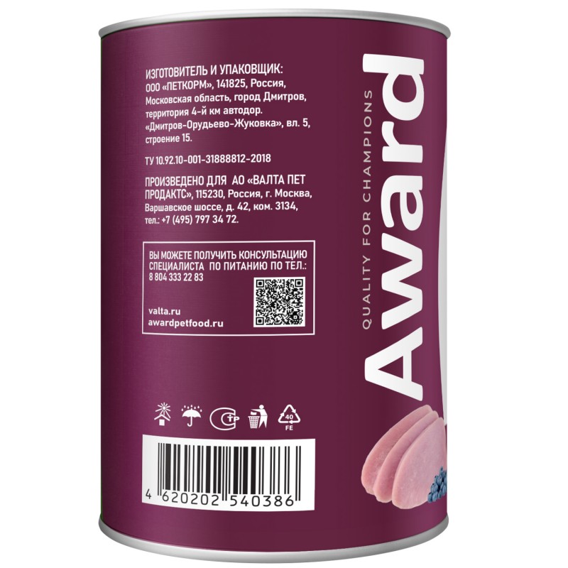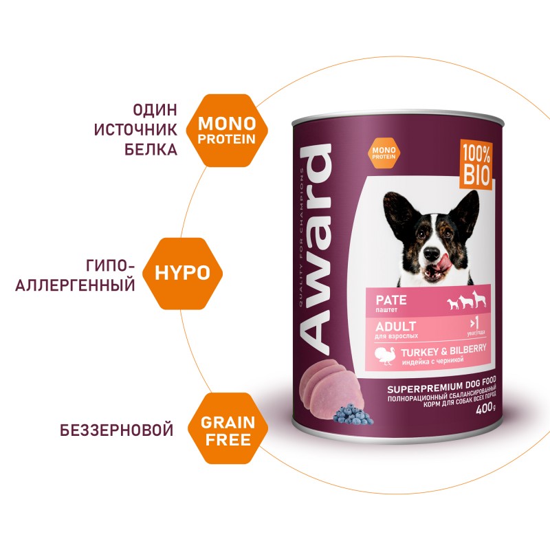 Купить AWARD Влажный корм для взрослых собак паштет из индейки с черникой 400г вы можете в компании Zookормов.ru, оформив заказ в интернет магазине, или