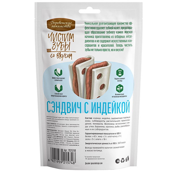 Купить Деревенские лакомства Чистим Зубы для собак средних пород, сэндвич с индейкой, 90 г вы можете в компании Zookормов.ru, оформив заказ в интернет магазине, или