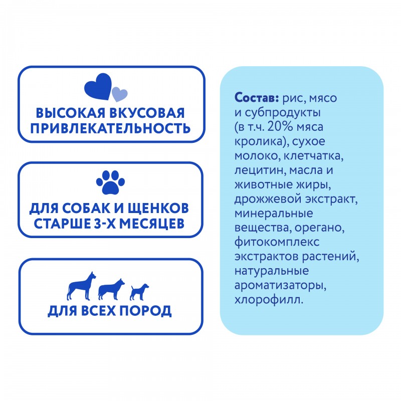 рис, мясо и субпродукты (в том числе 20% мяса кролика), сухое молоко, клетчатка, лецитин, масла и животные жиры, дрожжевой экстракт, минеральные вещества, орегано, фитокомплекс экстрактов растений, натуральные ароматизаторы, хлорофилл.