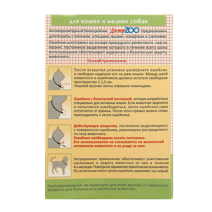 РЕКОМЕНДАЦИИ: После надевания ошейника необходимо тщательно вымыть руки водой с мылом. Не рекомендуется применять больным или ослабленным животным, беременным (в последнюю треть беременности) или кормящим самкам, а также котятам моложе 2-х месяцев.